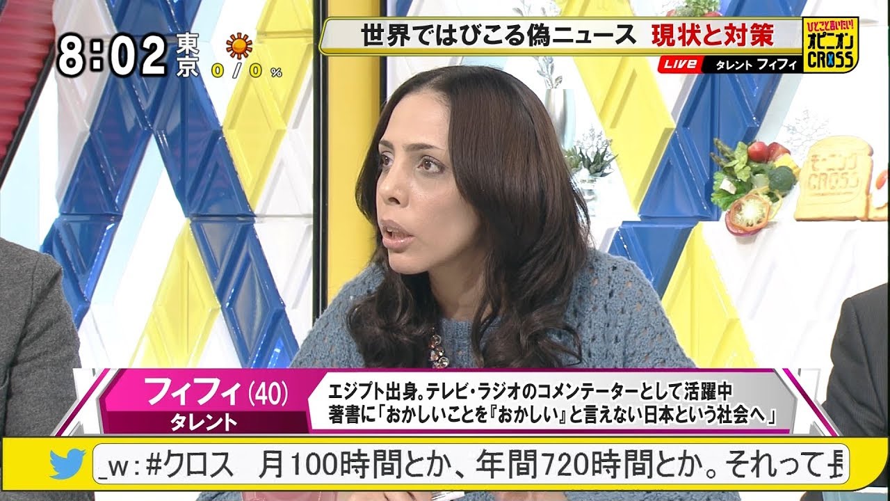 フィフィ「見る側、読む側、伝える側、メディアリテラシー、すべてを信じる前に、一回ちょっと待てよと。一呼吸置く、落ち着いてから考える」 フィフィ「SNSで拡散されるデマニュース どうしたらいい?」 世界ではびこる偽ニュース [モーニングCROSS]2017年1月31日(火) モーニングCROSS - ひとこと言いたい!オピニオンCROSSフィフィ(タレント)【出演】堀潤 / 宮瀬茉祐子 【コメンテーター】網屋信介 / フィフィ / 湯浅卓