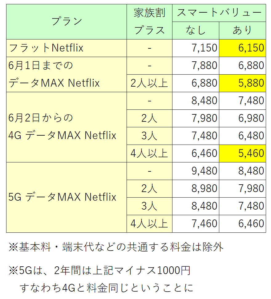 また家族割プラスが4人以上でない(=2人や3人)ならば、6月1日までの現データMAX Netflixの方が、6月2日以降より安い。5Gは2年間は料金同じ。