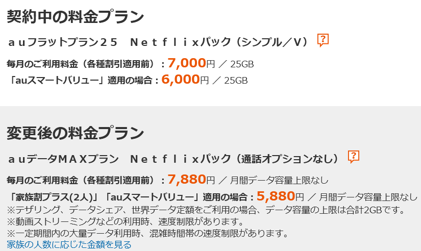更によく見ると、6月2日からの料金は、家族割プラスが4人以上であれば、5460円(スマホ応援割II含まず)と更に安いものの、2人や3人の場合は今より高い。であれば、これ今のうちにデータMAX Netflixに変えておくのが最善策って感じなんですかね。