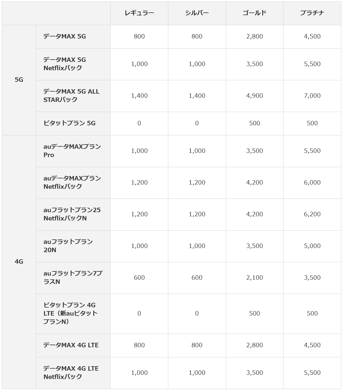 そして通信料(※端末代は含まない)で1000円ごとに+100pt。契約年数に応じたポイントとは別で、固定のプラス100ptです。なので何をどうやってもauユーザーでいる限りauゴールドカードで払った方がお得だったわけですが・・・1万円クーポンがないと、余程のヘビーユーザーか、もしくはメインクレカをauゴールドカードにしないとたぶん損なんですよねコレ。