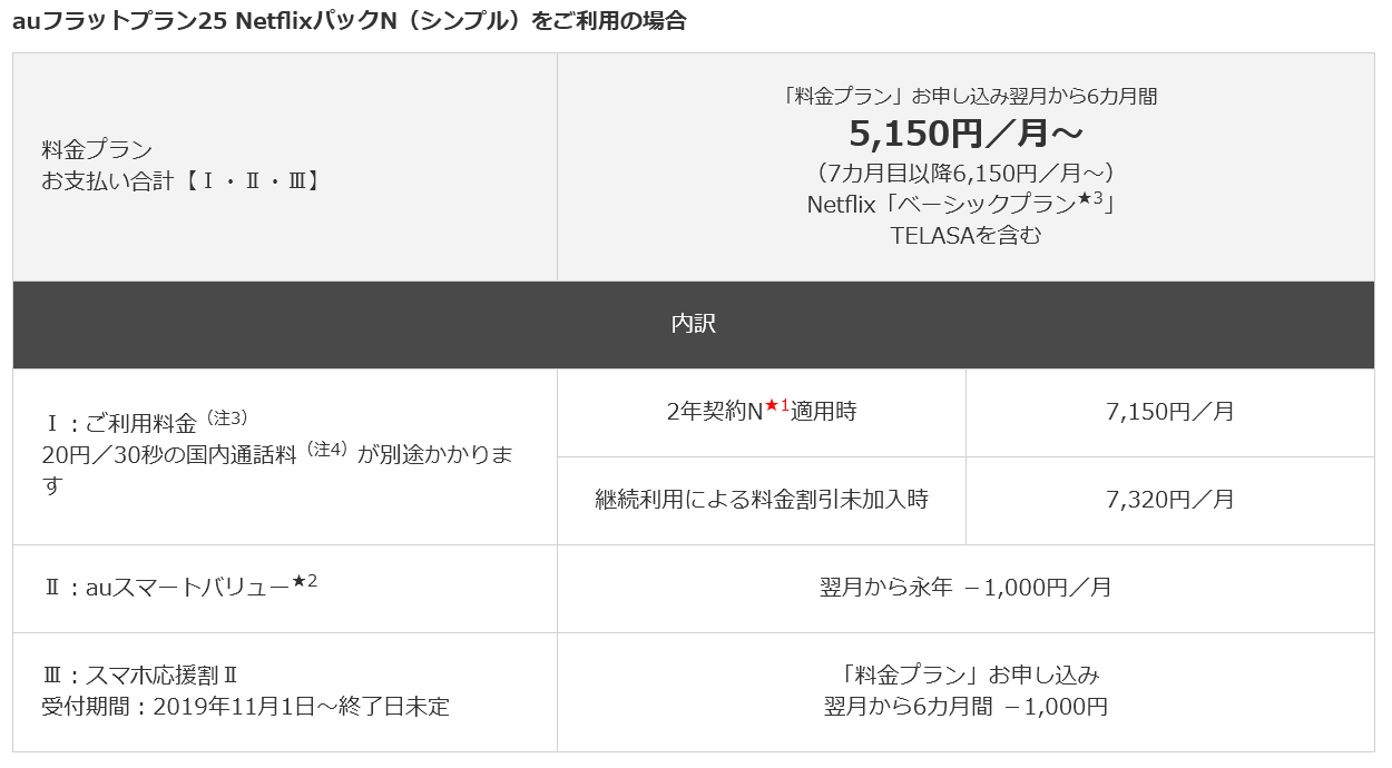 私が今契約しているauの料金プランは、Netflixが値上げする前のNetflixプラン。これプラン変更しない限りずっと月額6000円(今契約すると6150円)なんですね。地味にお得。あ、スマートバリューは含みます。