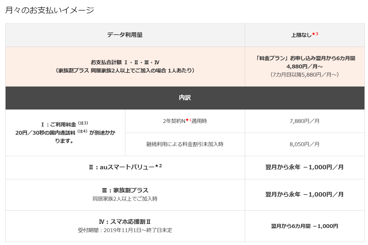 auスマートバリュー、5Gスタートキャンペーン(2年間毎月1000円引き)、家族割プラス4人(永年2020円引き)。半年限定のスマホ応援割IIもありますが、半年間なのでこれは計算から除外するべきですかね。