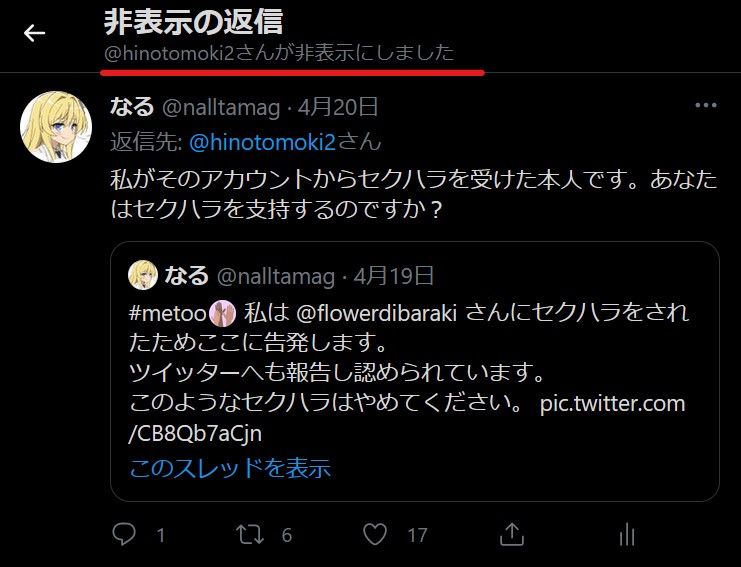 唯一、日野さんが私のリプライを非表示に設定した日は不明です。非表示になっていることは事実です。