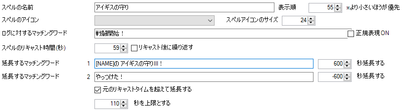 延長するマッチングワードとして、自分がアイギスの守りなどを使用した時のログメッセージを入れます。延長時間を無駄に大きな数にし、上限を設定しておくのが手っ取り早いと思います。技の種類とか変更するとき、上限時間いじるだけでいいですからね。